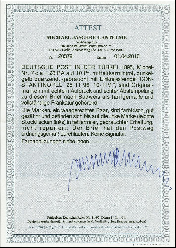 | Zusatzinformationen und Suchstichworte: | 382. Auktion Heinrich Köhler 18. – 23. September 2023 Los 3558 1895, 20 Pa. auf 10 Pfg. mittel(karmin)rot im waagerechten Paar mit Stempel "CONSTANTINOPEL DP 1** 28.11.96" als portogerechte Mehrfachfrankatur auf Firmen-Vordruckbrief nach Budweis, Österreich mit Ankunftstempel. Die linke Marke mit wenigen Stockpunkten in der Zähnung, sonst in einwandfreier Erhaltung, eine sehr seltene Mehrfachfrankatur dieser Farbe, Fotoattest Jäschke-L. BPP (2010) Ausruf 500,00 EUR |