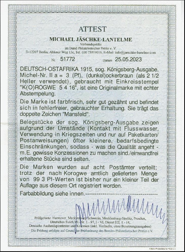 | Zusatzinformationen und Suchstichworte: | 382. Auktion Heinrich Köhler 18. – 23. September 2023 Los 3605 Königsberg-Ausgabe: 1915, Germania 3 Pfg. ockerbraun, farbfrisch mit Stempel "K(O)ROGWE DOA 5.4.16" in tadelloser Erhaltung. Bisher sind nur wenige Exemplare aus Korogwe registriert und in dieser Qualität ein äußerste seltene Marke, Fotoattest Jäschke-L. BPP (2023) Ausruf 800,00 EUR |