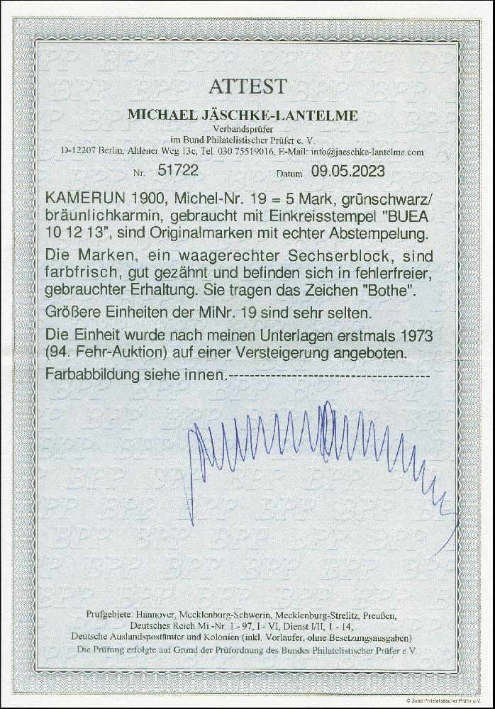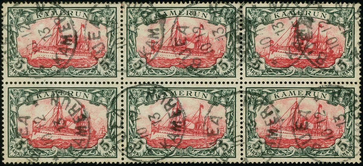 | Zusatzinformationen und Suchstichworte: | 382. Auktion Heinrich Köhler 18. – 23. September 2023 Los 3638 5 M. im waagerechten 6er-Block, farbfrisch und gut gezähnt, sauber gestempelt "BUEA 10 12 13", tadellos, eine sehr seltene und attraktive Einheit, sign. Bothe sowie Fotoattest Jäschke-L. BPP (2023) Ausruf 800,00 EUR |