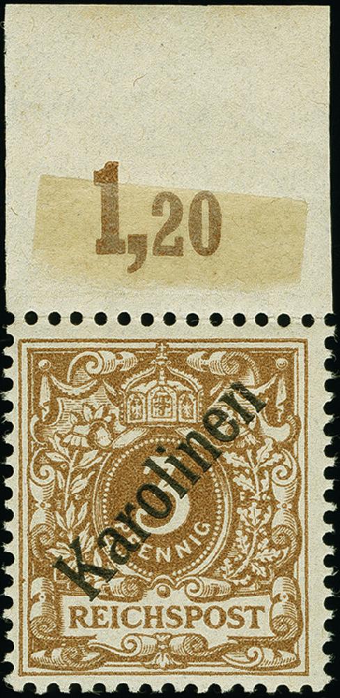 | Zusatzinformationen und Suchstichworte: | 382. Auktion Heinrich Köhler 18. – 23. September 2023 Los 3648 1899, Krone/Adler 3 Pf. lebhaftorangebraun, farbfrisches Oberrandstück mit Reihenzahl "1,20", postfrisch, einwandfrei, sign. Friedl und Fotoattest Steuer BPP (2009) Ausruf 300,00 EUR |