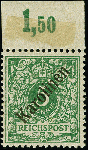 | Zusatzinformationen und Suchstichworte: | 382. Auktion Heinrich Köhler 18. – 23. September 2023 Los 3650 5 Pf. lebhaftopalgrün, farbfrisches Oberrandstück mit Reihenzahl "1,50", postfrisch, einwandfrei, sign. Friedl und Fotoattest Steuer BPP (2009) Ausruf 300,00 EUR |