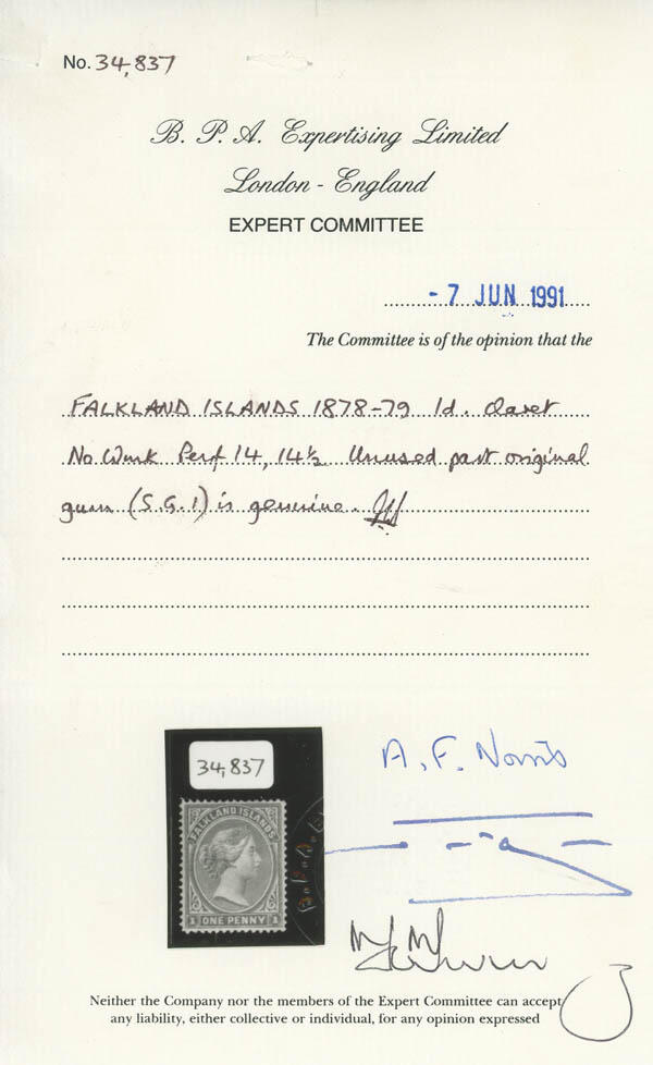 | Zusatzinformationen und Suchstichworte: | 62. Golden Oak Online Auktion 25.-26. August 2023 Los 23 Falkland Falklandinseln, 1878, Königin Victoria, 1d weinrot, ohne Wasserzeichen (SG 1), Originalgummi, gefalzt, Pracht, mit 1991 B. P. A. Attest. Scott 1 $850, SG £750 ($930) ; Schätzpreis $200 - 300 Ausruf 240,00 USD |
