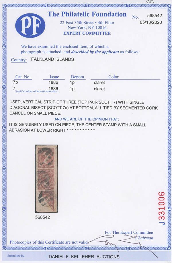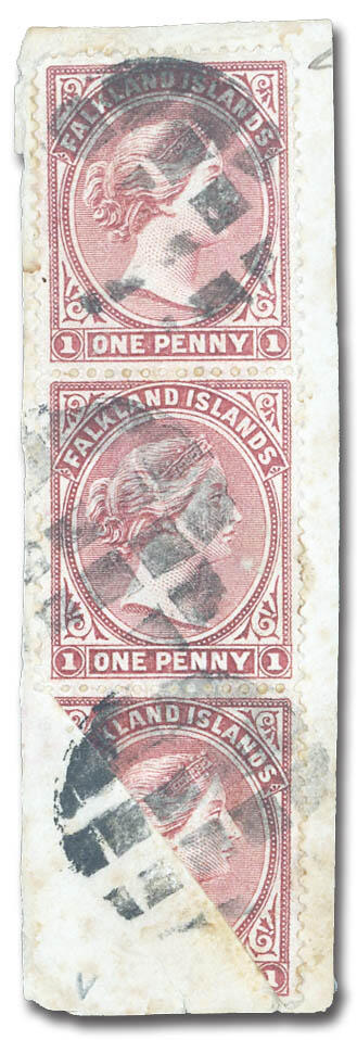 | Zusatzinformationen und Suchstichworte: | 62. Golden Oak Online Auktion 25.-26. August 2023 Los 25 Falkland Falklandinseln, 1891, Königin Victoria, 1d bräunlich weinrot, schräg halbiert (SG 8a), im senkrechter Dreierstreifen mit 2 Normalmarken, gestempelt auf Briefstück, feinst bis Pracht Katalogwerte sind für Anwendung auf volles Umschlägen, mit 2020 P. F. Attest. Scott 7b $4,250, SG £4,000 ($4,960) ; Schätzpreis $300 - 400 Ausruf 240,00 USD |
