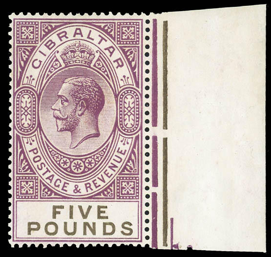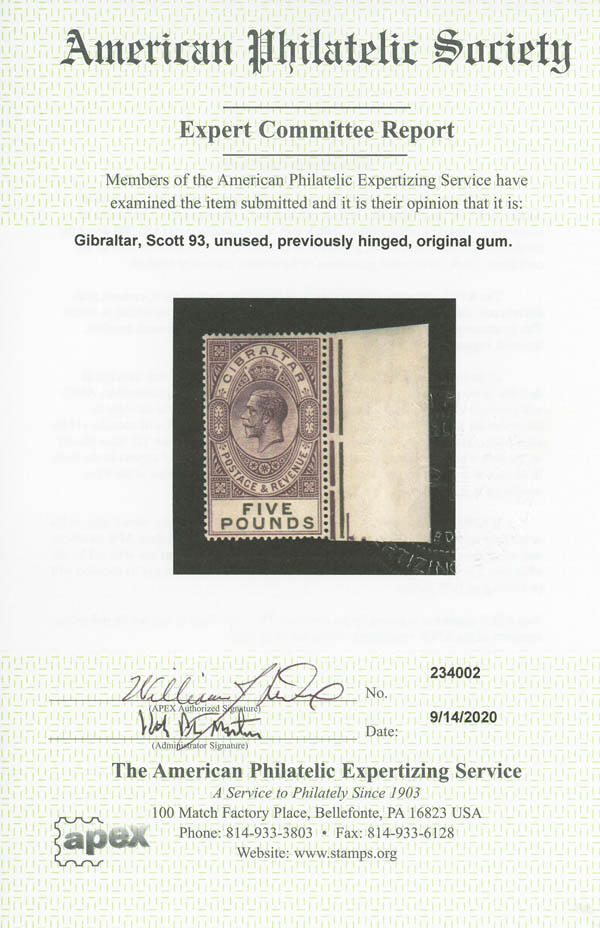 | Zusatzinformationen und Suchstichworte: | 62. Golden Oak Online Auktion 25.-26. August 2023 Los 41 Gibraltar Gibraltar, 1925, König Georg V, £5 violett und schwarz, Wasserzeichen CA mehrfach (SG 108), Originalgummi, geringfügig gefalzt, Pracht, mit 2020 A. P. S. Attest. Scott 93 $1,750, SG £1,600 ($1,980) ; Schätzpreis $600 - 800 Ausruf 425,00 USD |