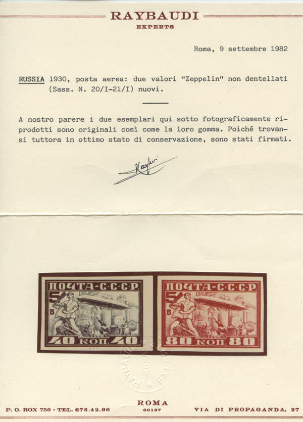 | Zusatzinformationen und Suchstichworte: | 62. Golden Oak Online Auktion 25.-26. August 2023 Los 187 Sowjetunion Russland, Luftpost, 1930, Zeppelin und Fünfjahrplan komplett, ungezähnte Einzelmarken (C12b-C13b), 40k mit Bogenrand, Originalgummi, gefalzt oder kleiner Falzrest, Pracht, jede signiert doppelt, mit ein 1982 Raybaudi Attest für beide. Michel 390 C-391 C etwa € 3,000 ($3,270), Scott $3,300; Schätzpreis $1,000 - 1,500 Ausruf 1.200,00 USD |