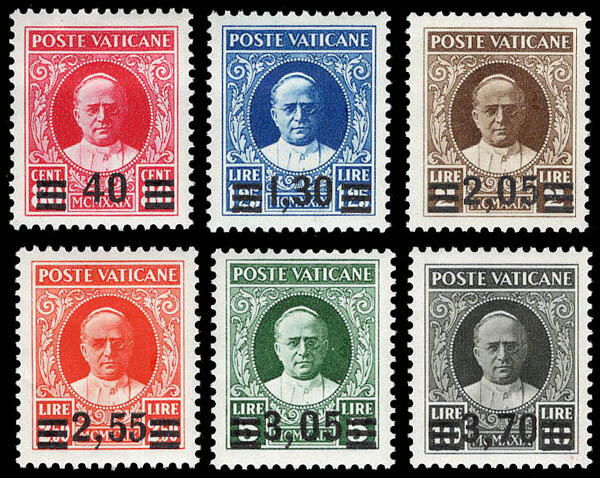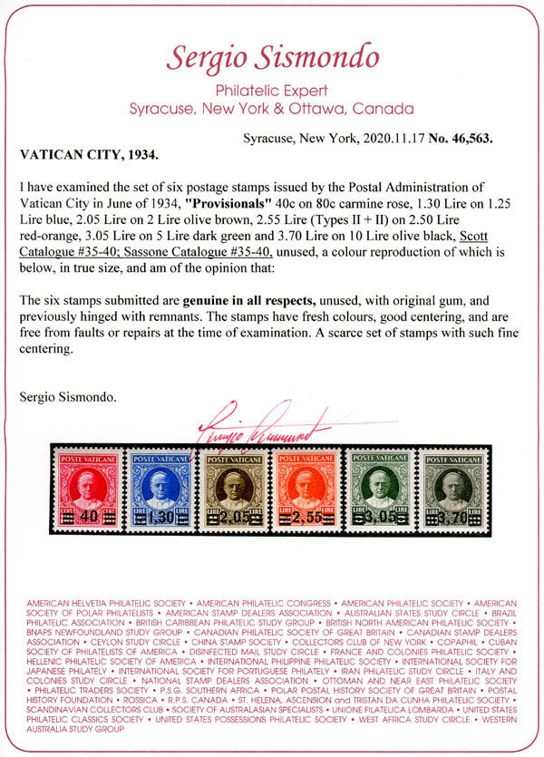 | Zusatzinformationen und Suchstichworte: | 62. Golden Oak Online Auktion 25.-26. August 2023 Los 216 Vatikanstaat Vatikan, 1934, provisorische Aufdrucke, 40c zu 3,70L komplett (35-40), Satz von 6, Originalgummi, Falzreste, Pracht, mit 2020 Sismondo Attest. Sassone 35-40 € 2,000 ($2,180), Scott $1,635; Schätzpreis $400 - 600 Ausruf 300,00 USD |