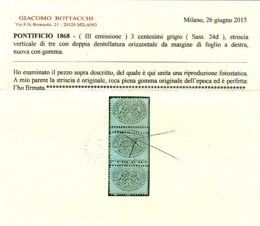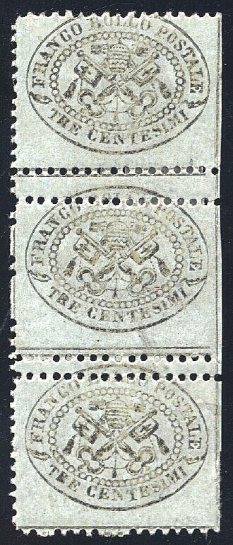 | Zusatzinformationen und Suchstichworte: | Filatelia Sammarinese Saalauktion 8. - 9. September 2023 Los 330 Italien Staaten Kirchenstaat III em. 3 c., striscia vert. di 3 es. con doppia dent. orizzontale e non dent. a destra (24+24d). Cert. Bot Ausruf 150,00 EUR |