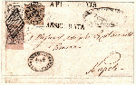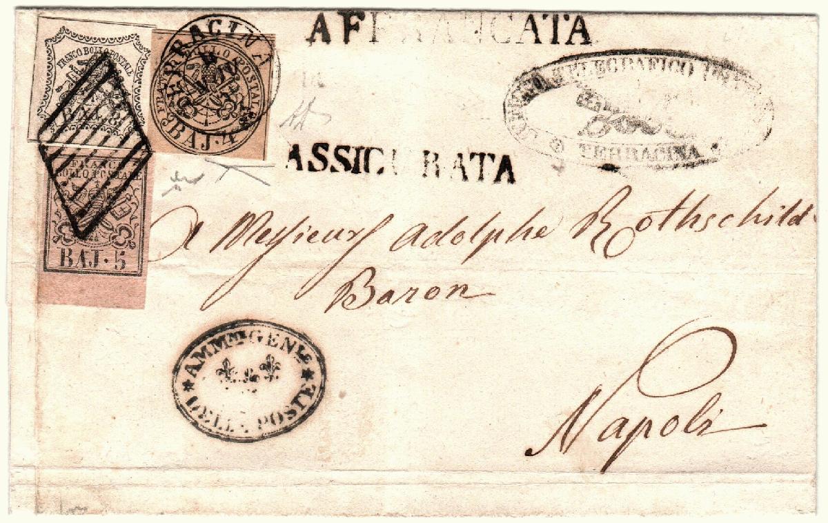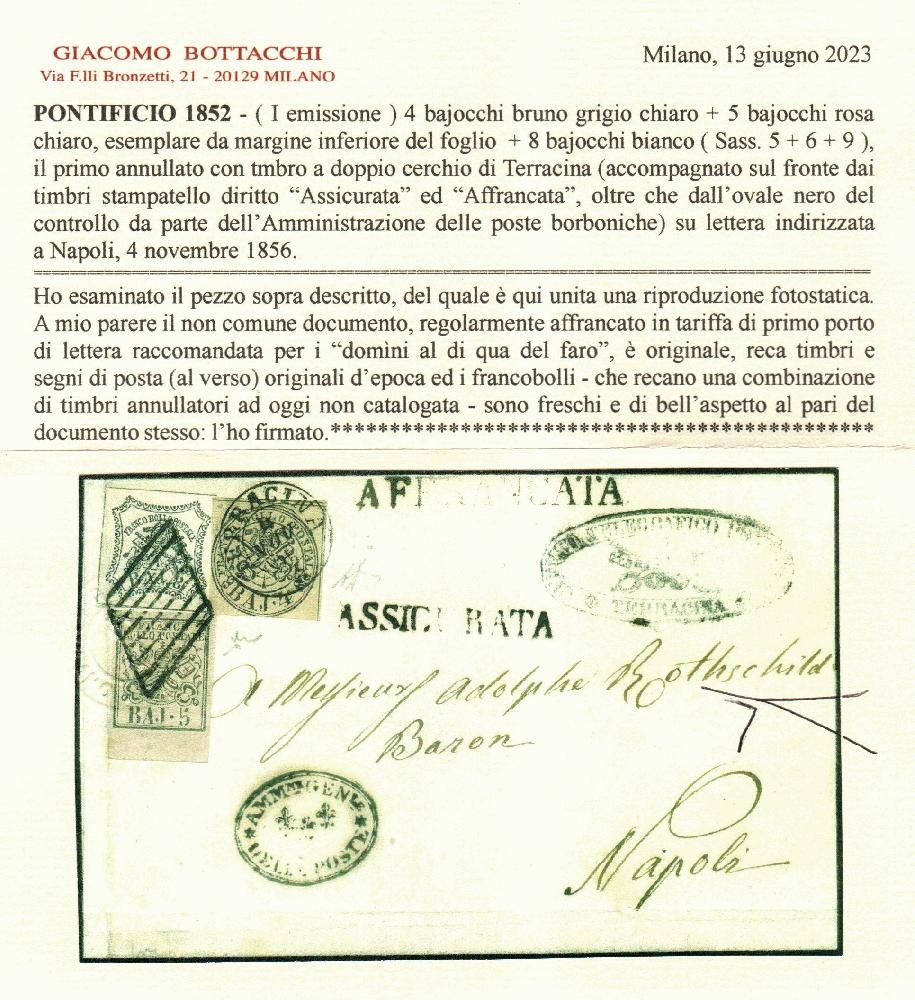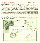 | Zusatzinformationen und Suchstichworte: | Filatelia Sammarinese Saalauktion 8. - 9. September 2023 Los 1181 Italien Staaten Kirchenstaat UFFICIO TELEGRAFICO POSTALE / TERRACINA - doppio ovale con Stemma Pontificio al centro su lettera AFFRANCATA e ASSICURATA - 2 bolli SD neri, da Terracina 4 NOV 56 a Napoli con 4 b. (5) ann. col datario e 5 + 8 baj. (6+9) ann. con la griglia. Il 4 b. + 5 b. con lievi difetti che nulla tolgono alla grande rarità del pezzo. Ex Imperato. AD, Chiav., cert. Bottacchi che recita "... rappresenta a tutt'oggi uno dei due soli casi a me noti di detta tipologia di corrispondenza..." Ausruf 2.000,00 EUR |