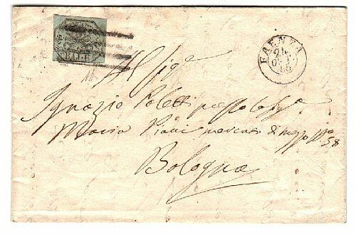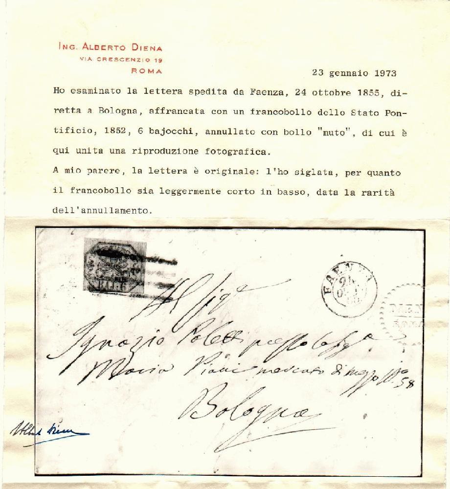 | Zusatzinformationen und Suchstichworte: | Filatelia Sammarinese Saalauktion 8. - 9. September 2023 Los 1216 Italien Staaten Kirchenstaat Da Faenza 24 OTT 55 a Bologna con 6 b. oleoso stampato su carta costolata, toccato in basso (7c) annullato col muto a 4 sbarre. Molto bella. Cert. AD Ausruf 400,00 EUR |