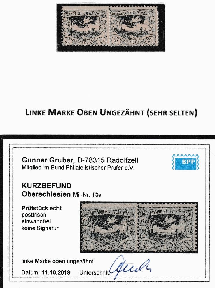| Zusatzinformationen und Suchstichworte: | Oberschlesien Mi-Nr. 13a, linke Briefmarke oben ungezähnt. Quelle: https://www.philaseiten.de/cgi-bin/index.pl?ME=268168#M66 |