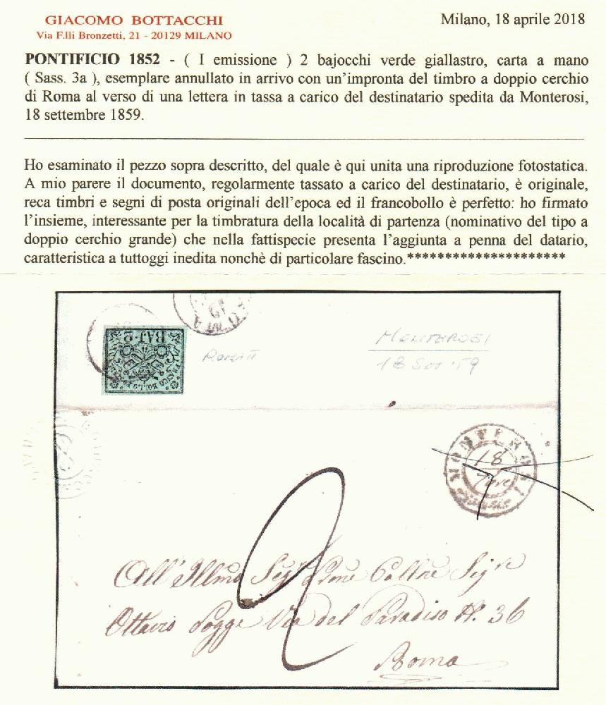 | Zusatzinformationen und Suchstichworte: | Filatelia Sammarinese Saalauktion 8. - 9. September 2023 Los 1227 Italien Staaten Kirchenstaat Da Monterosi 18 SET 1859 a Roma con al retro 2 b. (3) come tassa ann. col datario in arrivo. Interessante perchè il bollo di partenza ha al centro la data (giorno e mese) indicati a penna, caratteristica a tutt'oggi inedita. Cert. Bot Ausruf 650,00 EUR |