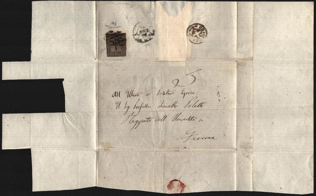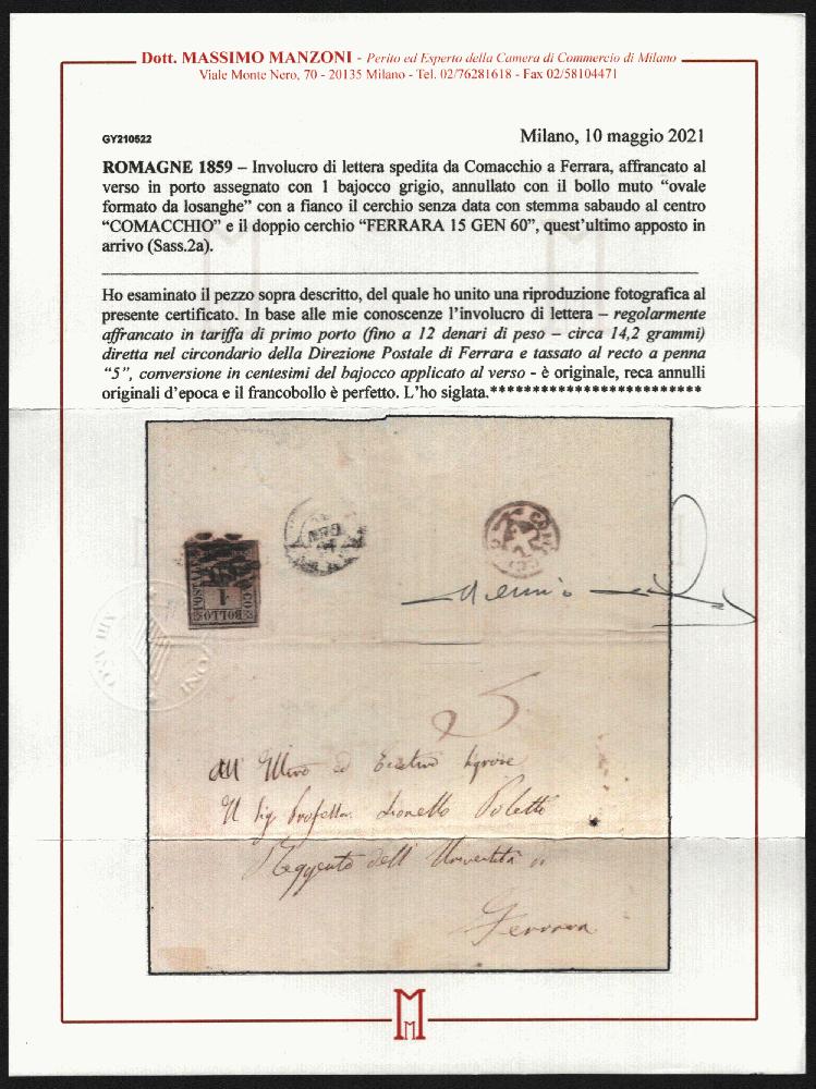 | Zusatzinformationen und Suchstichworte: | Versuch einer Übersetzung: Mailand, 10. Mai 2021 ROMAGNA 1859 - Briefumschlag von Comacchio nach Ferrara, rückseitig frankiert mit 1 Bajocco grau, gestempelt mit dem stummen Stempel "Oval von Rauten gebildet" mit undatiertem Kreis daneben mit dem Savoyer Wappen im Zentrum "COMACCHIO" und Doppelkreis "FERRARA 15 GEN 60", letzterer bei Ankunft angebracht (Sass.2a). Ich habe das oben beschriebene Stück begutachtet, von dem ich diesem Zertifikat eine fotografische Reproduktion beigefügt habe. Nach meinem Kenntnisstand ist der Briefumschlag - regulär frankiert mit dem ersten Portotarif (bis 12 Denari Gewicht - ca. 14,2 Gramm) an den Bezirk der Postdirektion Ferrara gerichtet und auf der Vorderseite mit Federzug "5" besteuert, Umrechnung in Centesimi des auf der Rückseite angebrachten Bajocco - original, hat originale Periodenstempel und die Briefmarke ist perfekt. Ich habe es signiert. |