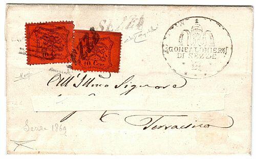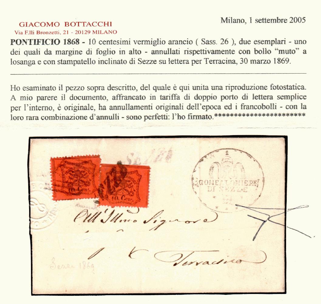 | Zusatzinformationen und Suchstichworte: | Filatelia Sammarinese Saalauktion 8. - 9. September 2023 Los 1243 Italien Staaten Kirchenstaat Da SEZZE - SI - 30 MAR 69 a Terracina con 10 c., 2 es. (26), uno ann. con il nominativo e l'altro con la griglia. Indirizzo parz. ritagliato. Insieme raro forse unico. Ray., Mezzadri, cert. Bot. (p.ti R1). Catalog price: 16500 EUR Ausruf 1.200,00 EUR |