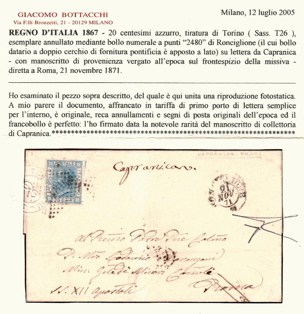 | Zusatzinformationen und Suchstichworte: | Filatelia Sammarinese Saalauktion 8. - 9. September 2023 Los 1264 Italien Staaten Kirchenstaat CAPRANICA - manoscritto su lett. a Roma con Regno 20 c. (26) ann. a punti 2480 di Ronciglione 21 NOV 71. Molto rara, Sassone R1. Ray., cert. Bot. Catalog price: 16500 EUR Ausruf 1.250,00 EUR |