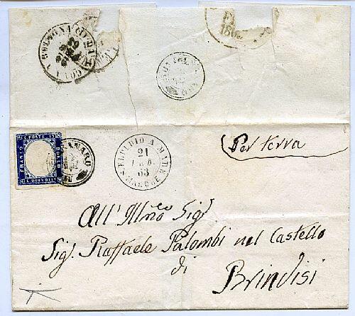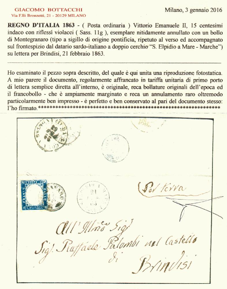 | Zusatzinformationen und Suchstichworte: | Filatelia Sammarinese Saalauktion 8. - 9. September 2023 Los 1275 Italien Staaten Kirchenstaat MONTEGRANARO - 2Csd al retro di lett. 21.2.63 (Sassone 13 p.ti) a Brindisi affr. con 15 c. tipo Sardo (11g) ann. anch'esso col C2 di Montegranaro. Raro insieme di ottima Qualità. Cert. Bot. Catalog price: 9000 EUR Ausruf 1.000,00 EUR |