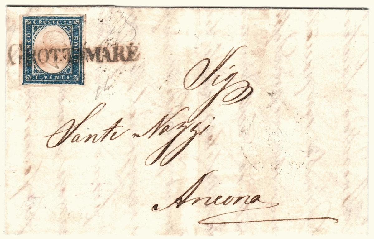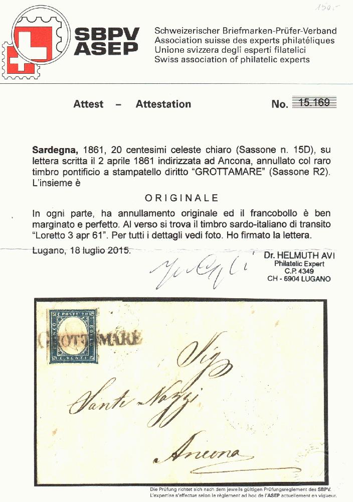 | Zusatzinformationen und Suchstichworte: | Filatelia Sammarinese Saalauktion 8. - 9. September 2023 Los 1273 Italien Staaten Kirchenstaat GROTTAMARE - SD unico ann. di 20 c. (15D) su lett. con testo del 2 Aprile 1861 per Ancona. Impronta rarissima (Sassone R2) di qualità lusso. Cert. Avi. Catalog price: 25100 EUR Ausruf 2.200,00 EUR |