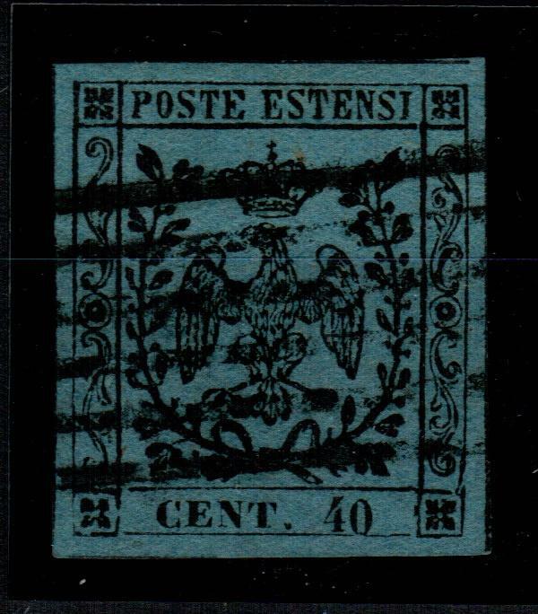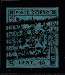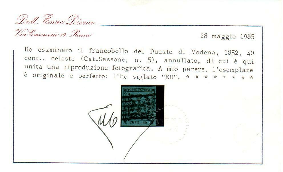 | Zusatzinformationen und Suchstichworte: | Filatelia Sammarinese Saalauktion 8. - 9. September 2023 Los 303 Italien Staaten Modena Senza punto 40 c. celeste (5) con annullo a sbarre, ben marginato e molto bello. Cert. ED, cert. Vaccari. Catalog price: 5000 EUR Ausruf 400,00 EUR |