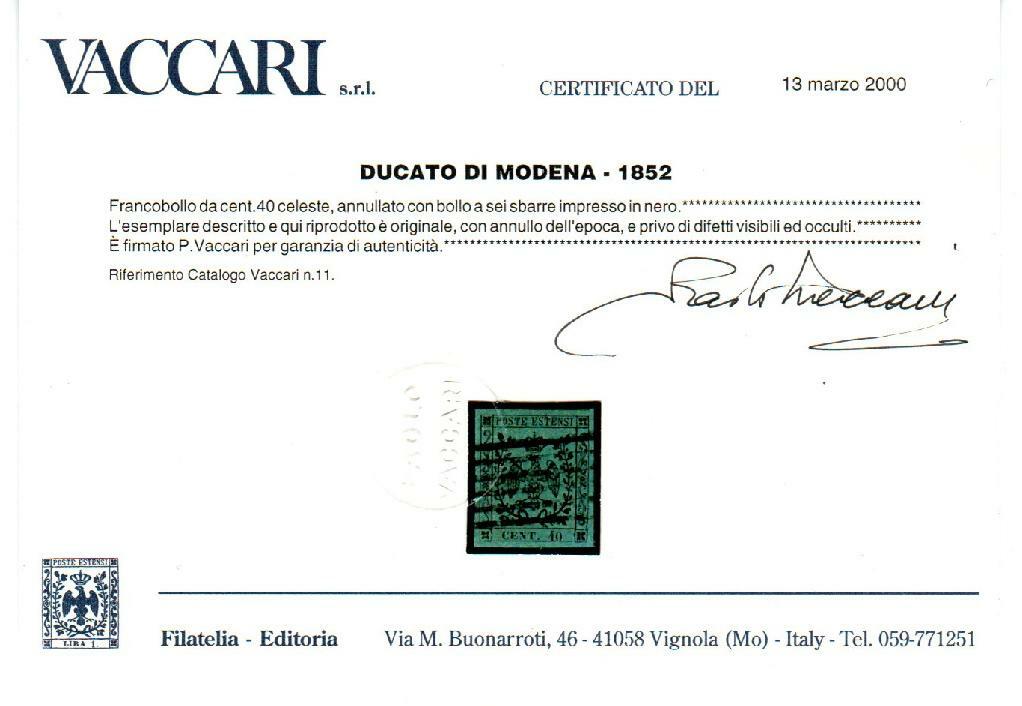 | Zusatzinformationen und Suchstichworte: | Filatelia Sammarinese Saalauktion 8. - 9. September 2023 Los 303 Italien Staaten Modena Senza punto 40 c. celeste (5) con annullo a sbarre, ben marginato e molto bello. Cert. ED, cert. Vaccari. Catalog price: 5000 EUR Ausruf 400,00 EUR |