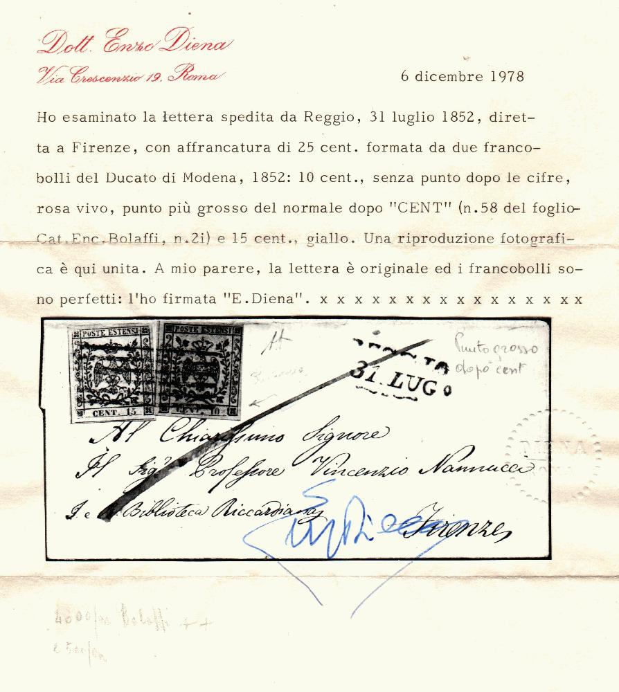 | Zusatzinformationen und Suchstichworte: | Filatelia Sammarinese Saalauktion 8. - 9. September 2023 Los 1015 Italien Staaten Modena Da Reggio 31 LUG (52) a Firenze con 10 c. (2a) con "punto grosso dopo la T" + 15 c. (3a) ann. a sbarre. Molto bella. AD, cert. ED Ausruf 800,00 EUR |