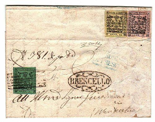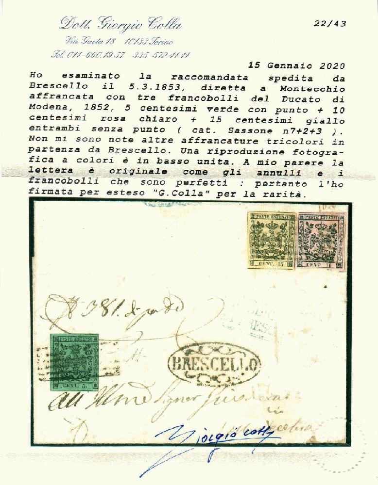 | Zusatzinformationen und Suchstichworte: | Filatelia Sammarinese Saalauktion 8. - 9. September 2023 Los 1021 Italien Staaten Modena Racc. da Brescello - ovale con fregi su lett. del 5 MAR 1853 a Montecchio con 5 c. (7) al recto e 15 + 10 (3+2) al verso, ann. col muto a sbarre. Molto rara. AD, cert. G. Colla Ausruf 2.250,00 EUR |