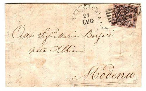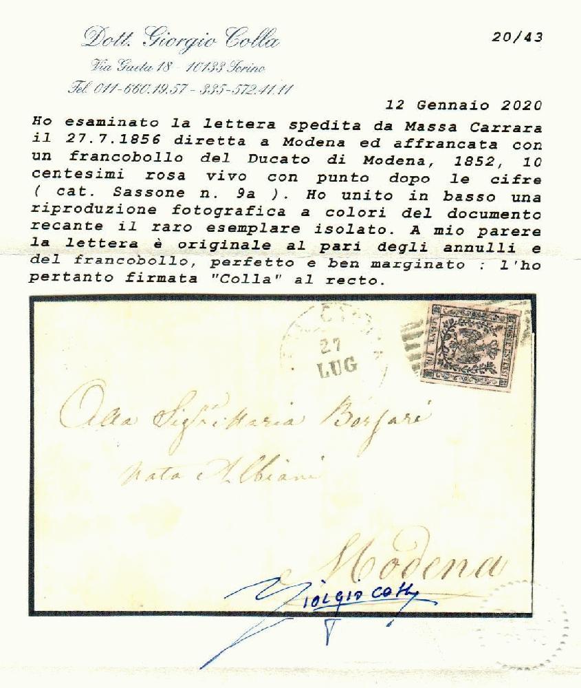 | Zusatzinformationen und Suchstichworte: | Filatelia Sammarinese Saalauktion 8. - 9. September 2023 Los 1023 Italien Staaten Modena Da Massa Carrara 27 LUG 1856 a Modena con 10 c. (9a) ann. a sbarre. Tagli di disinfezione. Interessante e non comune tariffa da 10 c. - AD, cert. Colla Ausruf 800,00 EUR |