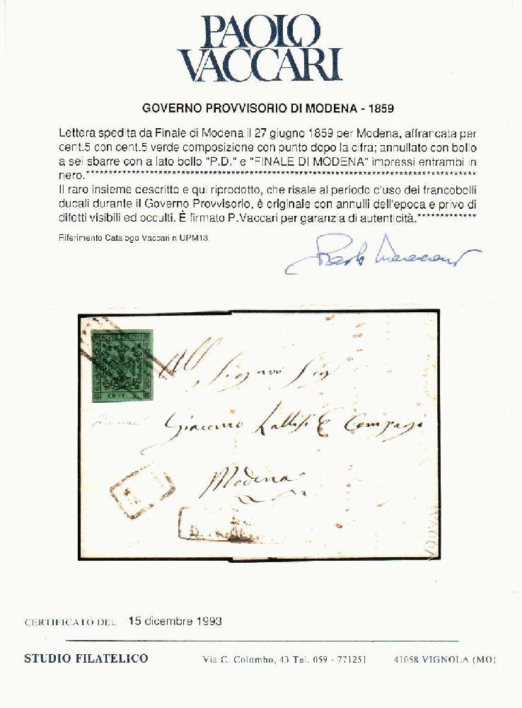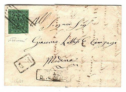 | Zusatzinformationen und Suchstichworte: | Filatelia Sammarinese Saalauktion 8. - 9. September 2023 Los 1029 Italien Staaten Modena Da Finale / Di Modena - cartella nera 27 GIU 1859 a Modena con 5 c. verde (7) ann. col muto a sbarre. Rara busta del periodo di Gov. Provvisorio. Cert. Vaccari Ausruf 1.750,00 EUR |
