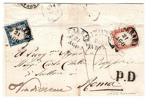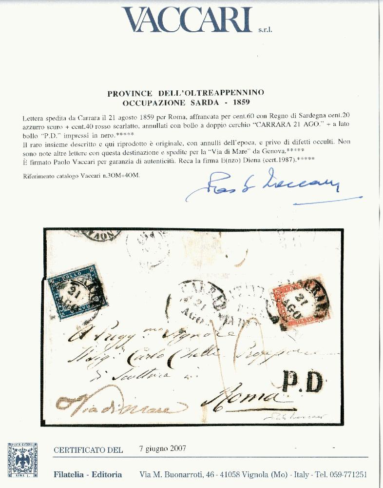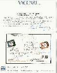 | Zusatzinformationen und Suchstichworte: | Filatelia Sammarinese Saalauktion 8. - 9. September 2023 Los 1031 Italien Staaten Modena Da Carrara 21 AGO (59) a Roma con Sardegna 20 c. azzurro scuro + 40 c. scarlatto (C3+C4). E' l'unica busta spedita dall'Oltreappennino diretta a Roma per la "Via di Mare" (al retro il bollo di Genova). Tassata 12 baiocchi - Il 20 c. presenta una piega perchè applicato a cavallo mentre il 40 c. ha un taglietto a destra. Grande rarità. Cert. E.Diena, cert. Paolo Vaccari Ausruf 25.000,00 EUR |