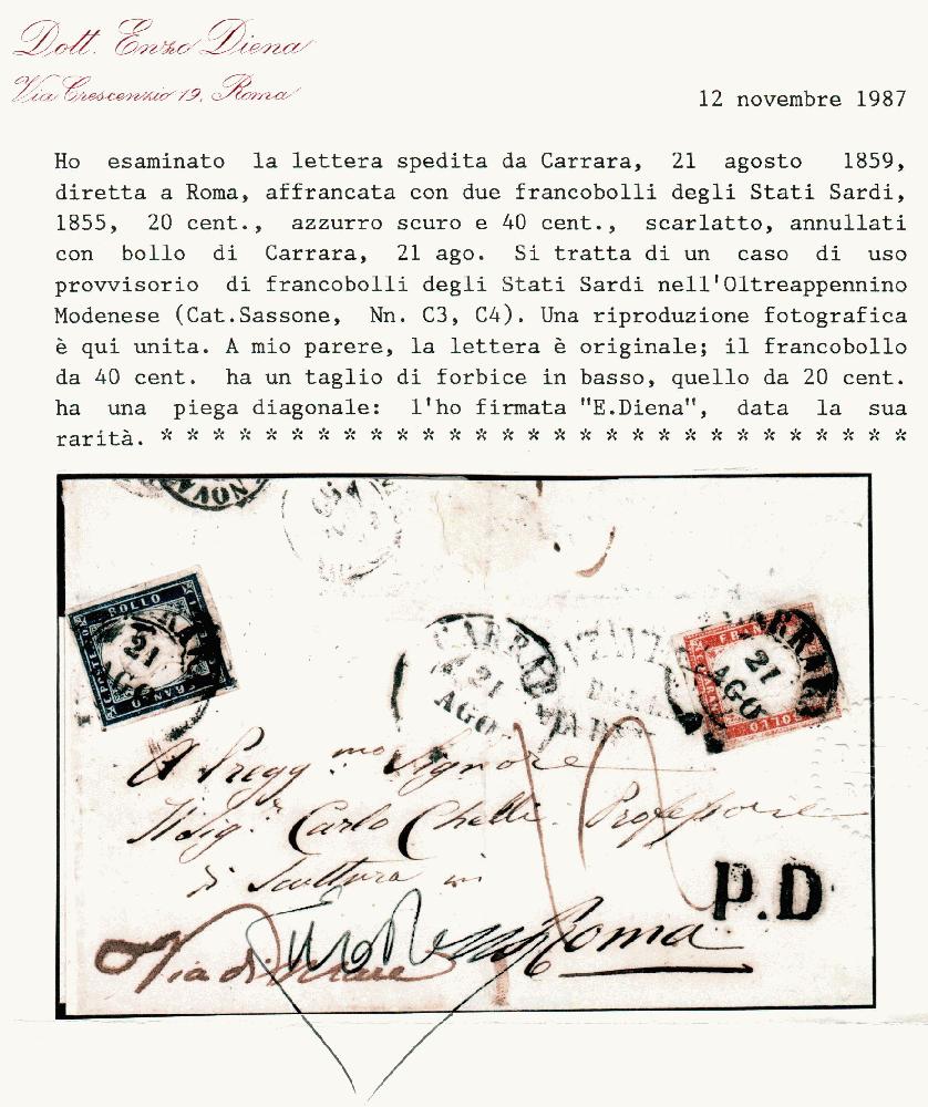 | Zusatzinformationen und Suchstichworte: | Filatelia Sammarinese Saalauktion 8. - 9. September 2023 Los 1031 Italien Staaten Modena Da Carrara 21 AGO (59) a Roma con Sardegna 20 c. azzurro scuro + 40 c. scarlatto (C3+C4). E' l'unica busta spedita dall'Oltreappennino diretta a Roma per la "Via di Mare" (al retro il bollo di Genova). Tassata 12 baiocchi - Il 20 c. presenta una piega perchè applicato a cavallo mentre il 40 c. ha un taglietto a destra. Grande rarità. Cert. E.Diena, cert. Paolo Vaccari Ausruf 25.000,00 EUR |