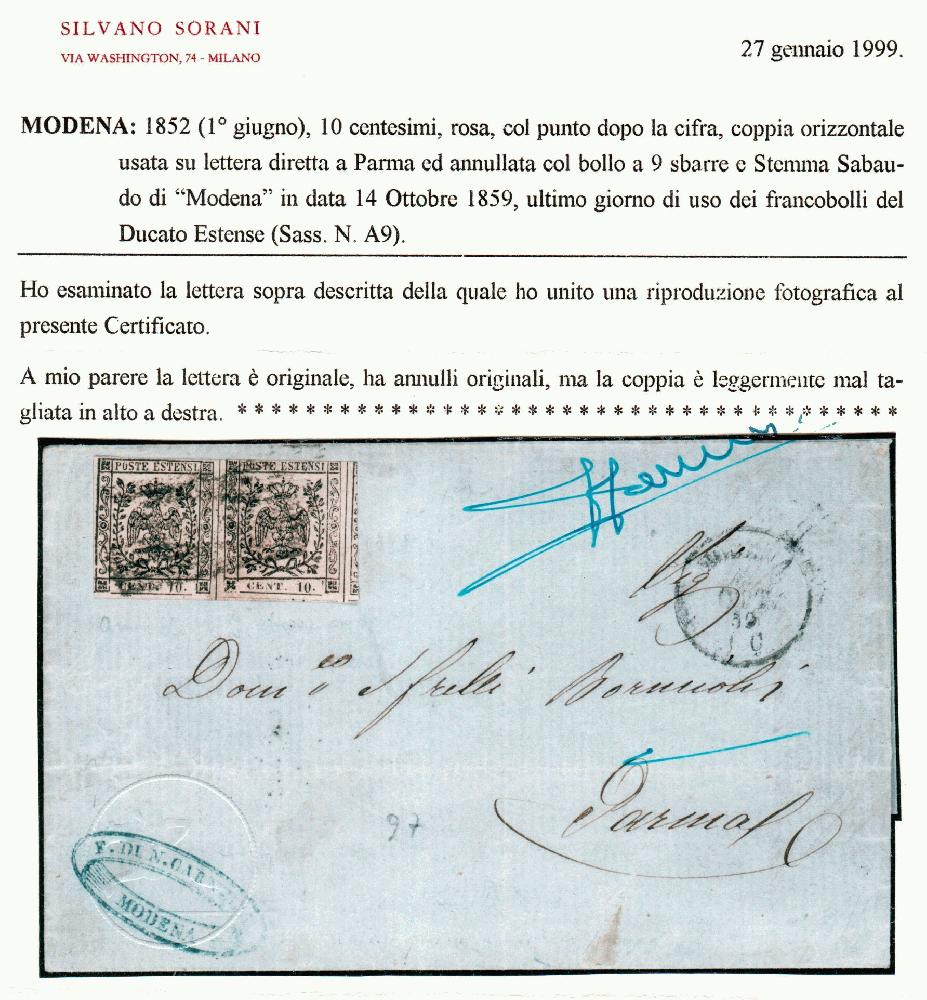 | Zusatzinformationen und Suchstichworte: | Filatelia Sammarinese Saalauktion 8. - 9. September 2023 Los 1035 Italien Staaten Modena Da Modena 14 OTTO 59 (manoscritto interno) a Parma ove giunse il 15 con coppia 10 c. (9) di cui l'es. destro corto in alto, ann. col bollo a 9 sbarre. Ultima data ufficiale dell'utilizzo dei franc. ducali. Rara. Cert. AD, cert. Sor Ausruf 2.000,00 EUR |