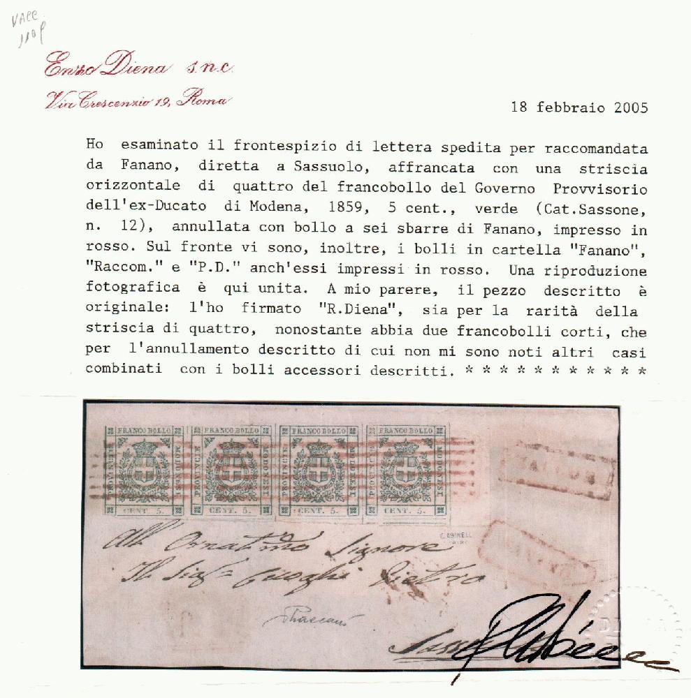 | Zusatzinformationen und Suchstichworte: | Filatelia Sammarinese Saalauktion 8. - 9. September 2023 Los 1037 Italien Staaten Modena Frontespizio di racc. da Fanano - cartella rossa a Sassuolo con Gov. Provvisorio 5 c., striscia di 4 es. bordo di foglio (12) con i primi 2 es. corti in alto, ann. con 3 impronte del muto a 6 sbarre rosse. Unica. Ray., cert. Vaccari, cert. R.Diena Ausruf 3.500,00 EUR |
