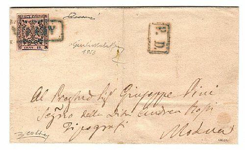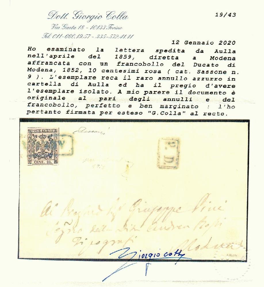 | Zusatzinformationen und Suchstichworte: | Filatelia Sammarinese Saalauktion 8. - 9. September 2023 Los 1038 Italien Staaten Modena AULLA cartella azzurra ann. di 10 c. (9) su lett. a Modena (13 APR 1859). Insieme raro. G. Bolaffi, Vaccari, cert. G. Colla Ausruf 2.000,00 EUR |