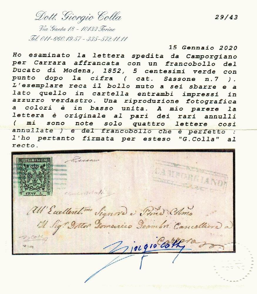 | Zusatzinformationen und Suchstichworte: | Filatelia Sammarinese Saalauktion 8. - 9. September 2023 Los 1040 Italien Staaten Modena Da Camporgiano a Carrara (al verso timbro d'arrivo del 1 settembre), affr. con 5 c. verde con un punto dopo la cifra (7) ann. con il muto a sei sbarre di Camporgiano e con a lato il bollo in cartella entrambi impressi in azzurro-verdastro. Una delle quattro lettere note così annullate. G. Bolaffi, Vaccari, cert. G. Colla Ausruf 2.400,00 EUR |