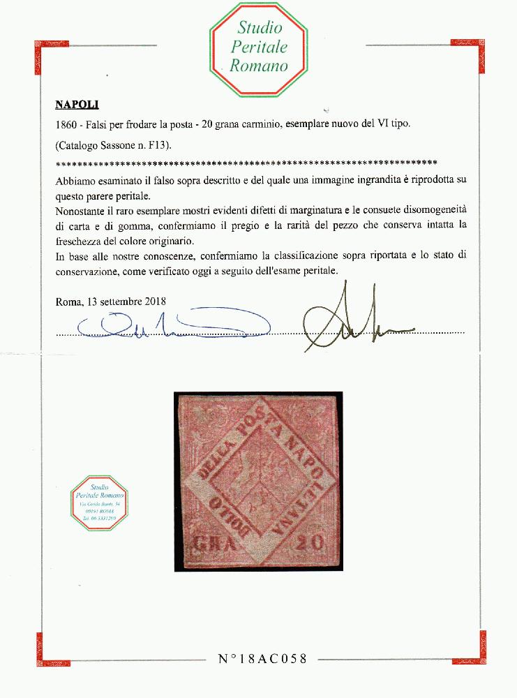 | Zusatzinformationen und Suchstichworte: | Filatelia Sammarinese Saalauktion 8. - 9. September 2023 Los 310 Italien Staaten Neapel Falso per servire 20 grana carminio VI tipo nuovo senza gomma ritagliato lungo il disegno (F.13). Grande rarità. Cert. Bot., cert. Peritale Romano. Catalog price: 25000 EUR Ausruf 2.000,00 EUR |