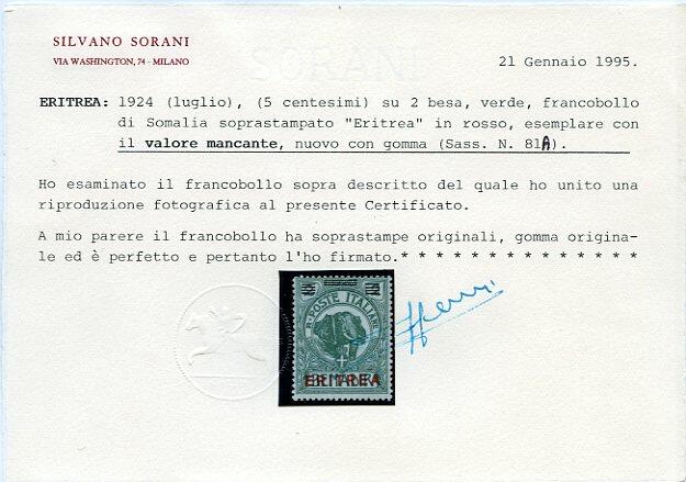 | Zusatzinformationen und Suchstichworte: | Filatelia Sammarinese Saalauktion 8. - 9. September 2023 Los 722 Italienisch Eritrea Valore mancante - Elefante (5 c.) su 2 c. verde sopr. rossa ERITREA (81A). Raro. Cert. Sor. Catalog price: 1500 EUR Ausruf 250,00 EUR |