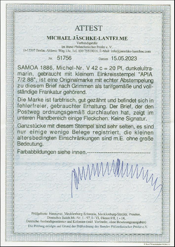 | Prüfer: | Jäschke-Lantelme, Michael (BPP (Bund Philatelistischer Prüfer)) |