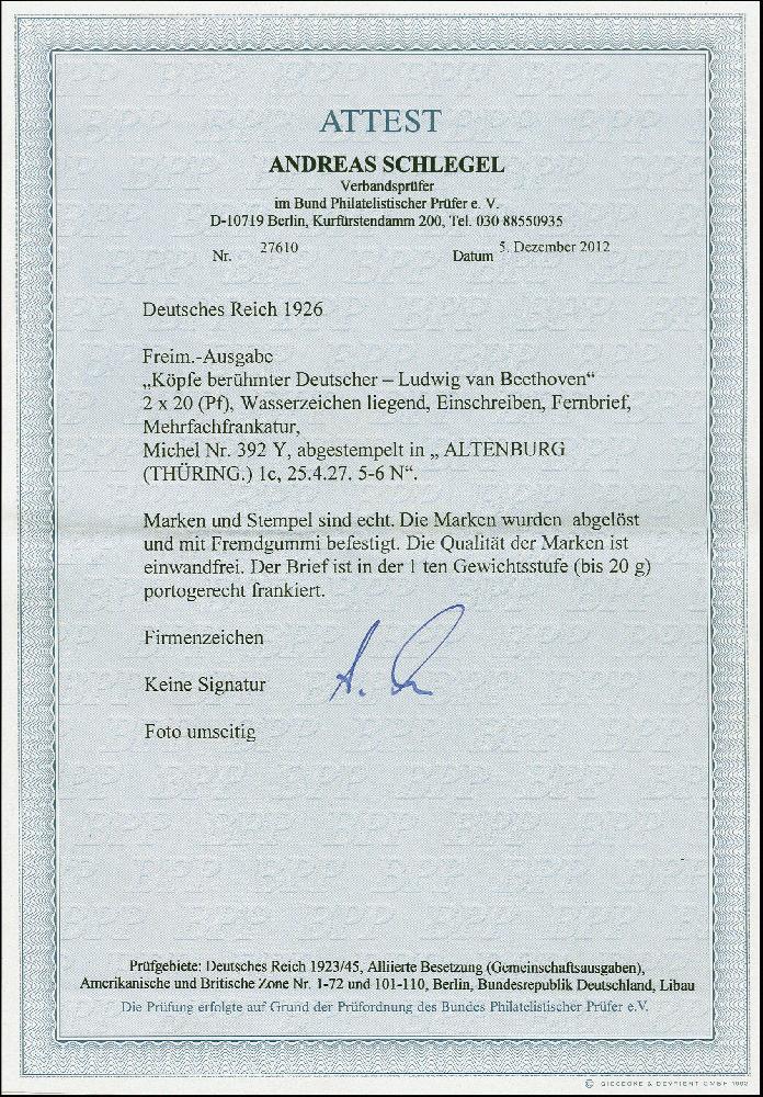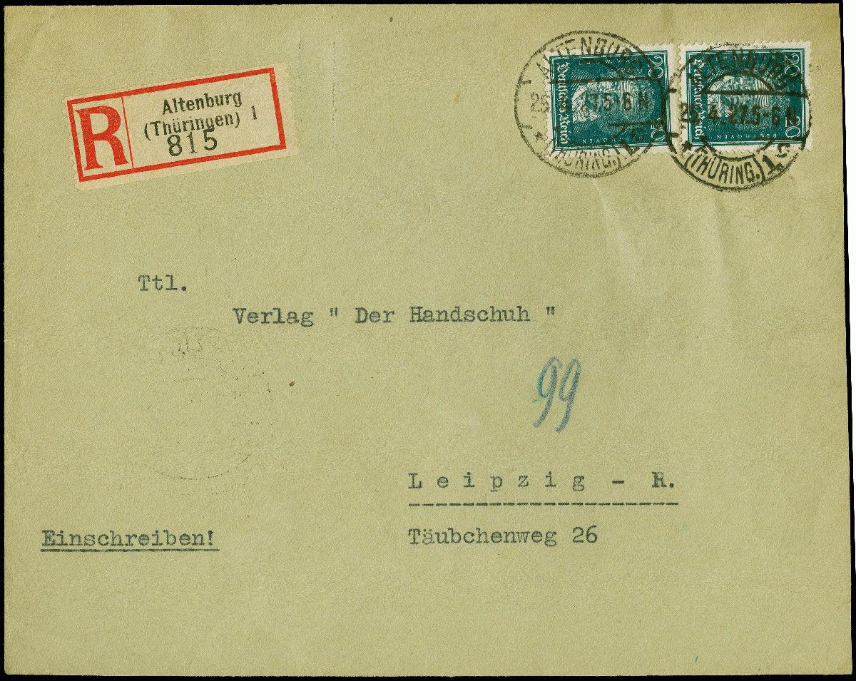 | Zusatzinformationen und Suchstichworte: | 382. Auktion Heinrich Köhler 18. – 23. September 2023 Los 5515 1926, Ludwig van Beethoven 20 Pfennig mit liegendem Wasserzeichen 2, zwei Einzelwerte mit Stempel "ALTENBURG 25.4.27" als portogerechte Mehrfachfrankatur auf R-Brief nach Leipzig mit Ankunftsstempel. Der Umschlag mit leichten Beförderungsspuren, beide Marken abgelöst und sind mit Fremdgummi befestigt, die Erhaltung beider Marken ist einwandfrei, sehr selten, signiert Müller und Fotoattest A. Schlegel BPP (2012) Ausruf 500,00 EUR |