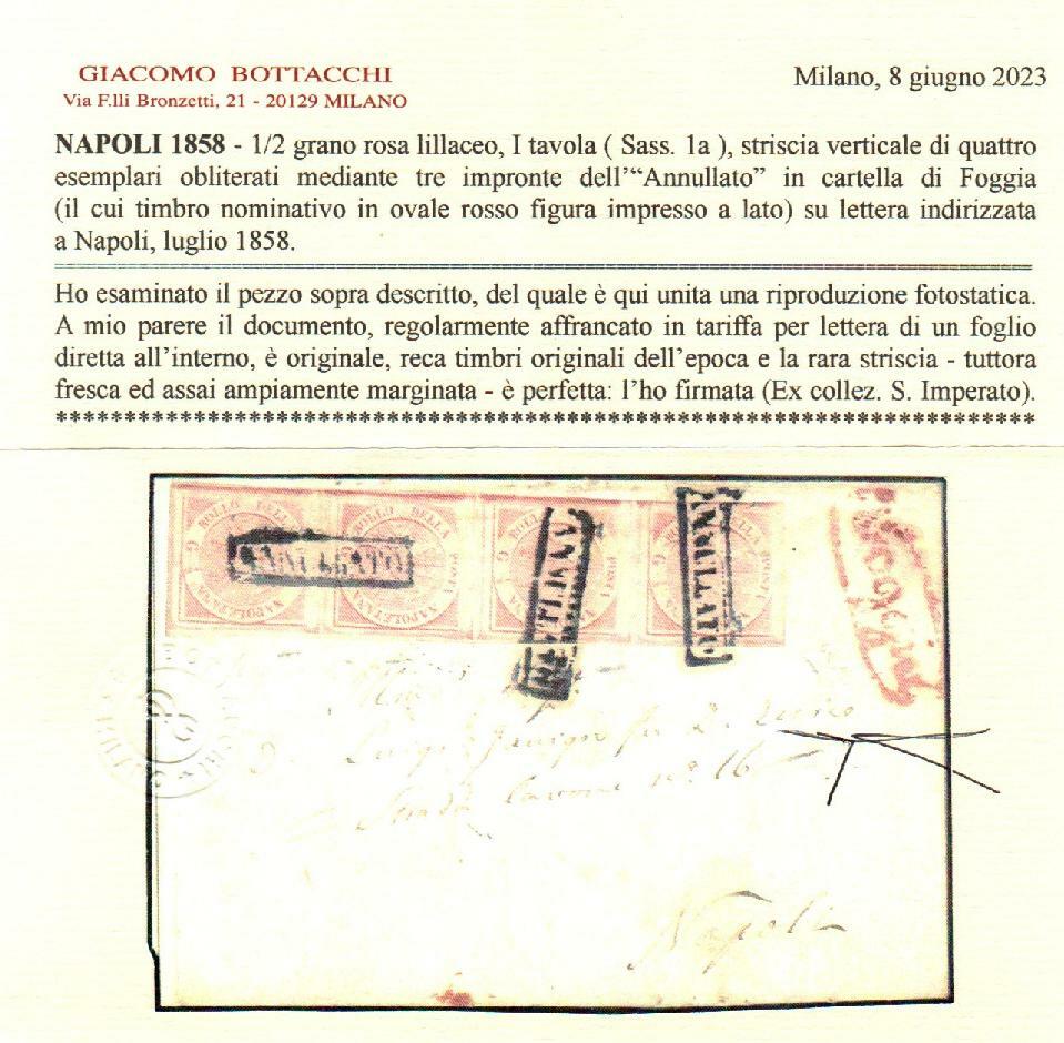 | Zusatzinformationen und Suchstichworte: | Filatelia Sammarinese Saalauktion 8. - 9. September 2023 Los 1061 Italien Staaten Neapel Da Foggia - ovale rosso - luglio 1858 a Napoli con striscia verticale di 4 del 1/2 grano rosa lillaceo (1a) con buoni margini annullata con tre impronte del bollo in cartella. Bella e rara. EmD, E.Diena, cert. Bot. - Ex Imperato. Catalog price: 10000 EUR Ausruf 850,00 EUR |