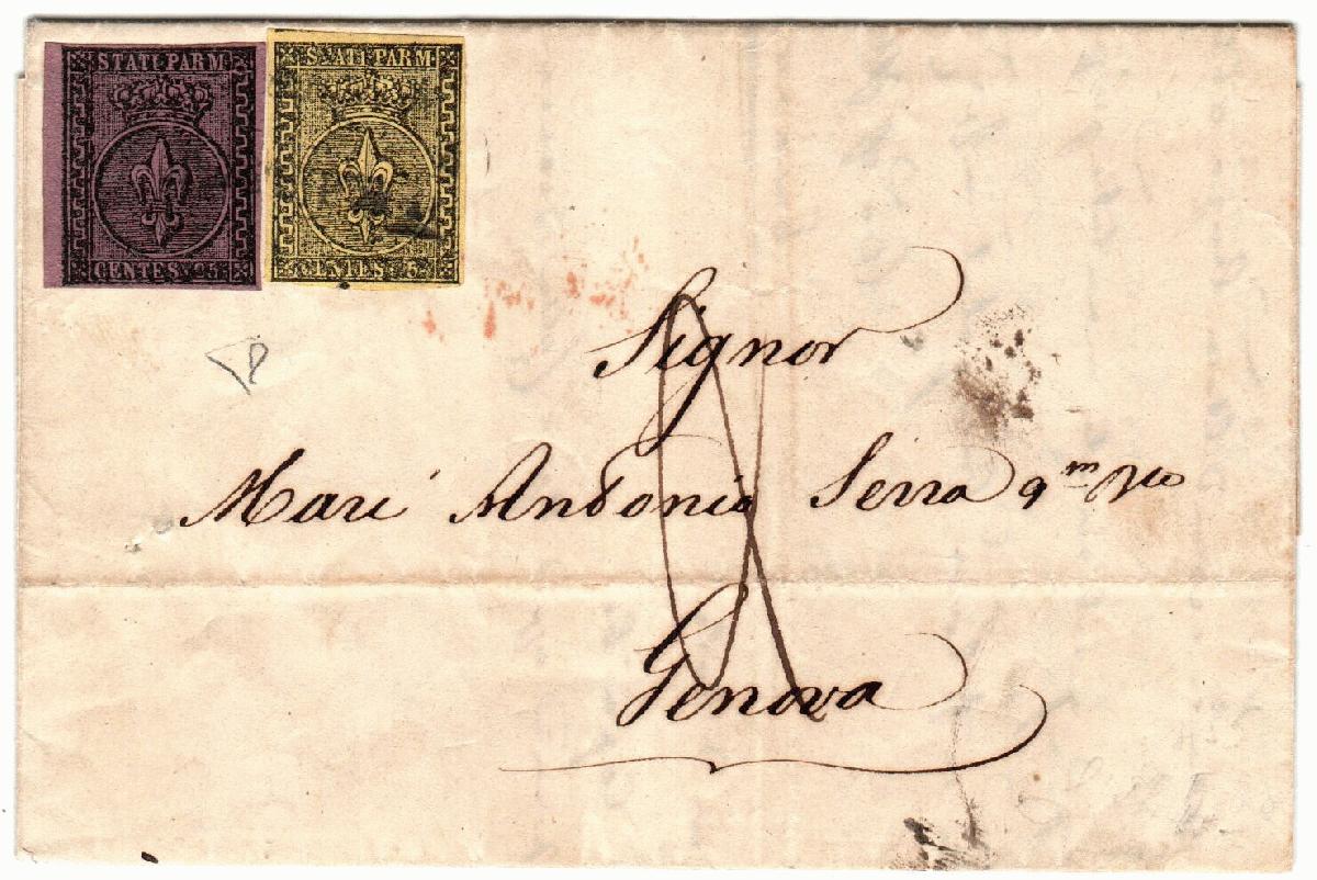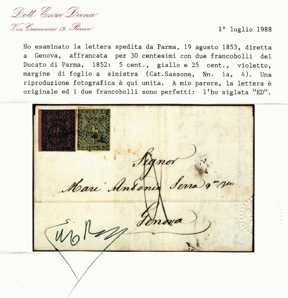 | Zusatzinformationen und Suchstichworte: | Filatelia Sammarinese Saalauktion 8. - 9. September 2023 Los 1125 Italien Staaten Parma Da Parma 19 AGO 1853 a Genova con 5 c. giallo + 25 c. violetto bordo di foglio a sinistra (1a+4). Tassata 2 all'arrivo. Bella. Cert. ED. Catalog price: 6000 EUR Ausruf 325,00 EUR |