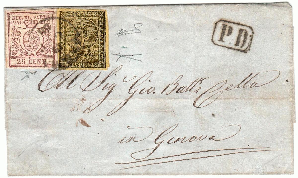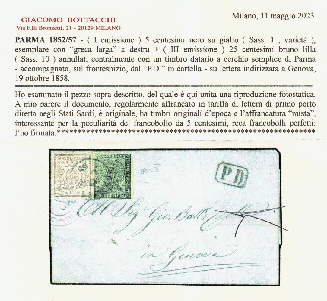 | Zusatzinformationen und Suchstichworte: | Filatelia Sammarinese Saalauktion 8. - 9. September 2023 Los 1130 Italien Staaten Parma Da Parma 19 OTT 58 a Genova con 5 c. I em. (1) con GRECA LARGA A DESTRA + 25 c. III em. (10). Il Sassone A.S.I. non riporta greche larghe per il 5 c. - Raro. Cert. Bot Ausruf 1.750,00 EUR |
