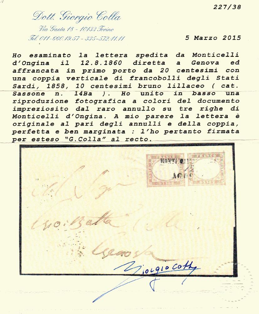| Zusatzinformationen und Suchstichworte: | Filatelia Sammarinese Saalauktion 8. - 9. September 2023 Los 1143 Italien Staaten Parma MONTICELLI D'ONGINA/12/AGOSTO - SD ann. di coppia 10 c. Sardegna (14Ba) su lett. a Genova. Rara, Sassone R1. Oliva. Cert. Colla. Catalog price: 18300 EUR Ausruf 3.000,00 EUR |