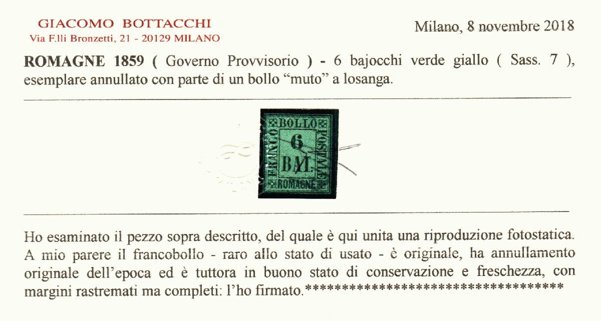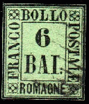 | Zusatzinformationen und Suchstichworte: | Filatelia Sammarinese Saalauktion 8. - 9. September 2023 Los 334 Italien Staaten Romagna 6 baj. verde giallo (7) ann. a griglia, con i margini rastremati ma completi (lilliput). Cert. Bot., cert. Peritale Romano. Catalog price: 16000 EUR Ausruf 500,00 EUR |