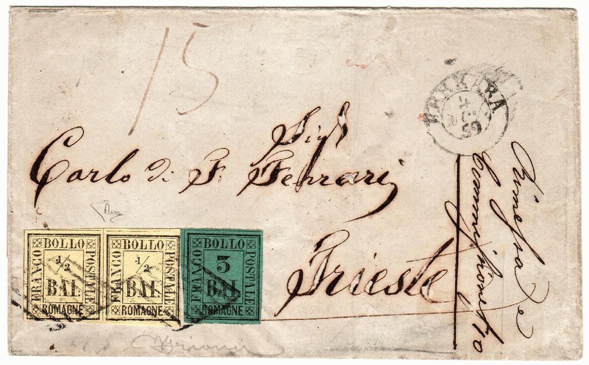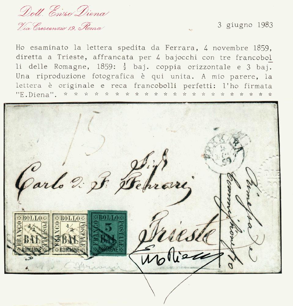 | Zusatzinformationen und Suchstichworte: | Filatelia Sammarinese Saalauktion 8. - 9. September 2023 Los 1295 Italien Staaten Romagna Da Ferrara 4 NOV 59 a Trieste con coppia 1/2 b. + 3 b. (1 + 4) ann. con 2 impronte della griglia. Tassata 15 kr. - Insieme non comune. Grioni, cert. E.Diena. Catalog price: 45000 EUR Ausruf 2.400,00 EUR |