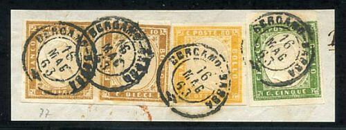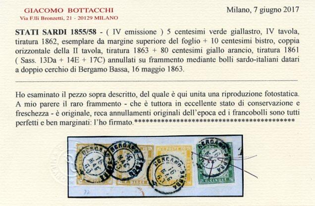 | Zusatzinformationen und Suchstichworte: | Filatelia Sammarinese Saalauktion 8. - 9. September 2023 Los 347 Italien Staaten Sardinien IV em. 5 c. + coppia 10 c. Sard. + 80 c. (13Da + 14E + 17C) su splendido frammento da Bergamo Bassa 16 MAG 63. Raro. Cert. Bot Ausruf 360,00 EUR |