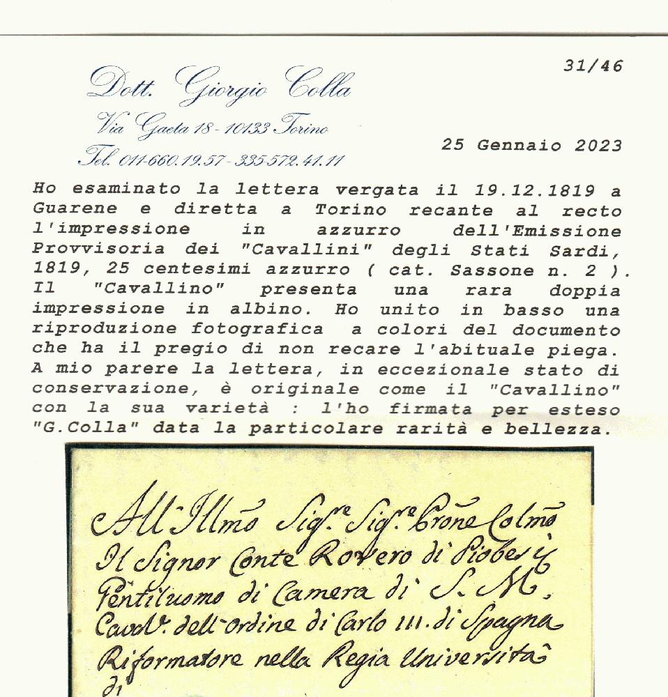 | Zusatzinformationen und Suchstichworte: | Filatelia Sammarinese Saalauktion 8. - 9. September 2023 Los 1300 Italien Staaten Sardinien Da Guarene 19 DIC 1819 a Torino foglio doppio senza filigrana con 2 impronte del Cavallino ovale da 25 c. di cui una in albino (2). Qualità e freschezza insuperabili senza l'usuale piega. Da esposizione. Cert. G. Colla Ausruf 2.000,00 EUR |