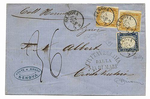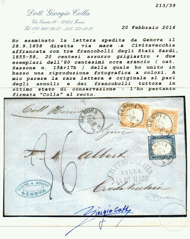 | Zusatzinformationen und Suchstichworte: | Filatelia Sammarinese Saalauktion 8. - 9. September 2023 Los 1332 Italien Staaten Sardinien Da Genova 28 SET 58 a Civitavecchia con Sard. 20 c. piegato + 80 c., 2 es. con margini leggermente intaccati (15A+17b). Bollo "Civitavecchia Dalla/Via di mare". Di ottimo aspetto. Ray., E. Diena, Grioni. Cert. Colla. Catalog price: 16825 EUR Ausruf 1.000,00 EUR |