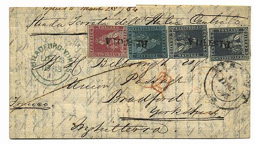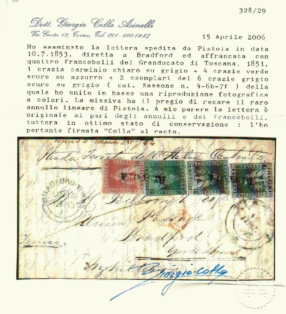 | Zusatzinformationen und Suchstichworte: | Filatelia Sammarinese Saalauktion 8. - 9. September 2023 Los 1395 Italien Staaten Toscana Da Pistoia 10.7.1853 a BRADFORD con 1 + 4 cr. + 6 cr., 2 es. (4+6b+7f) con un paio di margini intaccati, annullati con lo SD Pistoia ripetuto 2 volte. Manoscritto "Strada Ferrata dell'Italia Centrale". Sassone 11 pt. - Bell'insieme. Cert. Colla Ausruf 1.750,00 EUR |