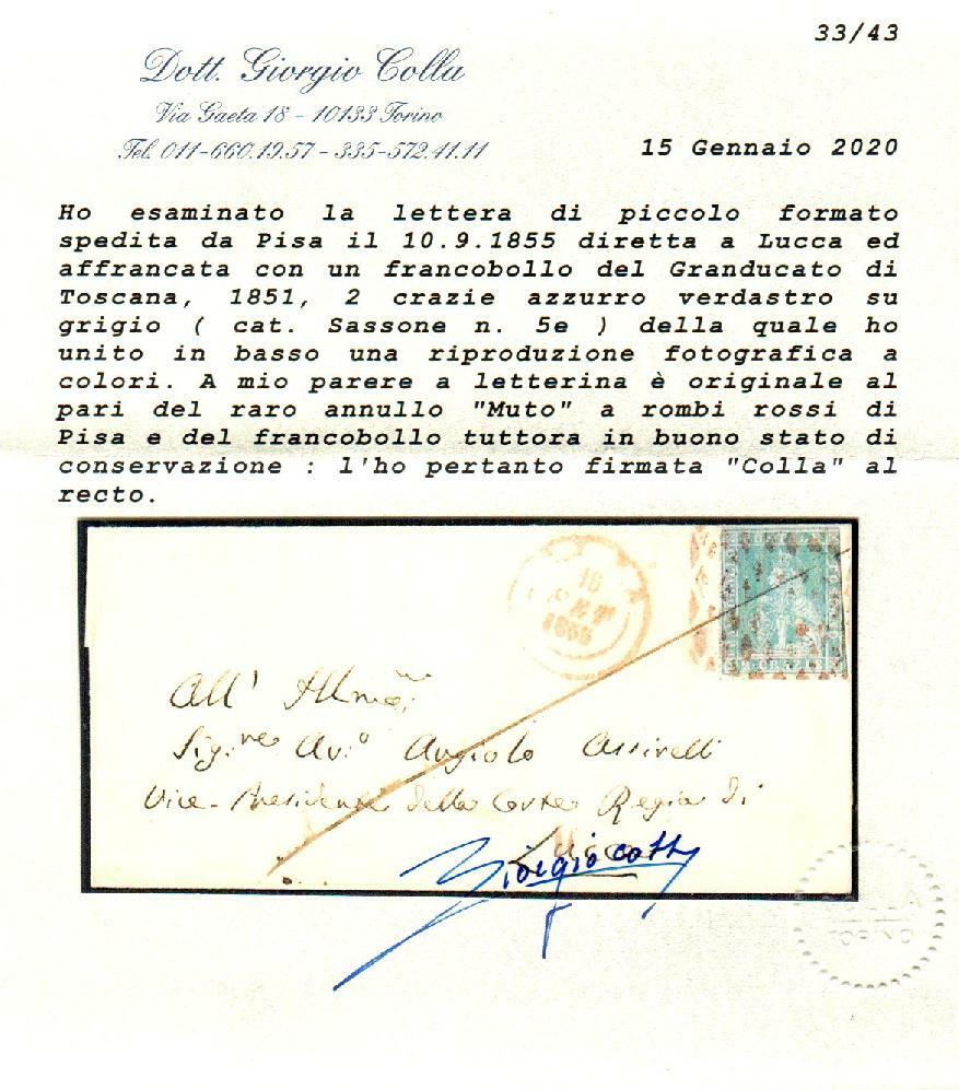 | Zusatzinformationen und Suchstichworte: | Filatelia Sammarinese Saalauktion 8. - 9. September 2023 Los 1431 Italien Staaten Toscana Da Pisa 16 SET 1855 - C2 rosso a Lucca con 2 cr. azzurro verdastro (5e) corto a destra, ann. col muto a rombi rossi (p.ti R1). Fresca e non comune. Cert. Colla Ausruf 500,00 EUR |