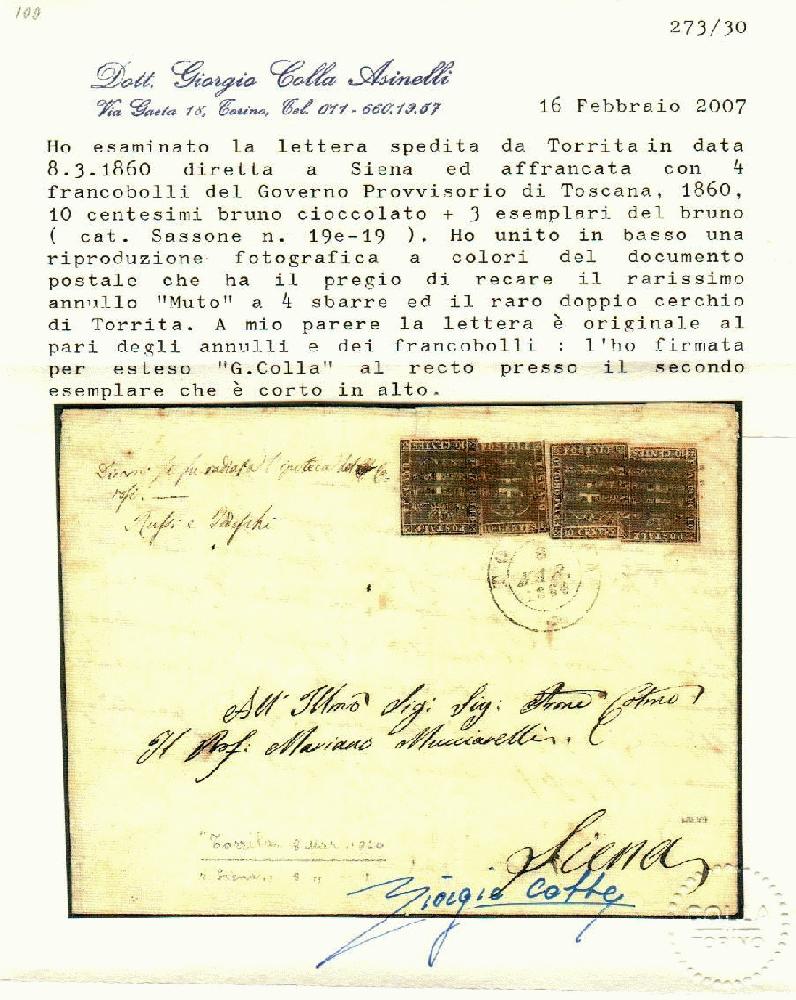 | Zusatzinformationen und Suchstichworte: | Filatelia Sammarinese Saalauktion 8. - 9. September 2023 Los 1451 Italien Staaten Toscana Da Torrita 8 MAR 1861 - C2 a Siena con Gov. Prov. 4 es. del 10 c. di cui 3 della tinta bruno ed uno bruno cioccolato (19+19e) ann. col rarissimo bollo muto a 4 sbarre. 2 margini corti. Cert. G. Colla Ausruf 2.200,00 EUR |