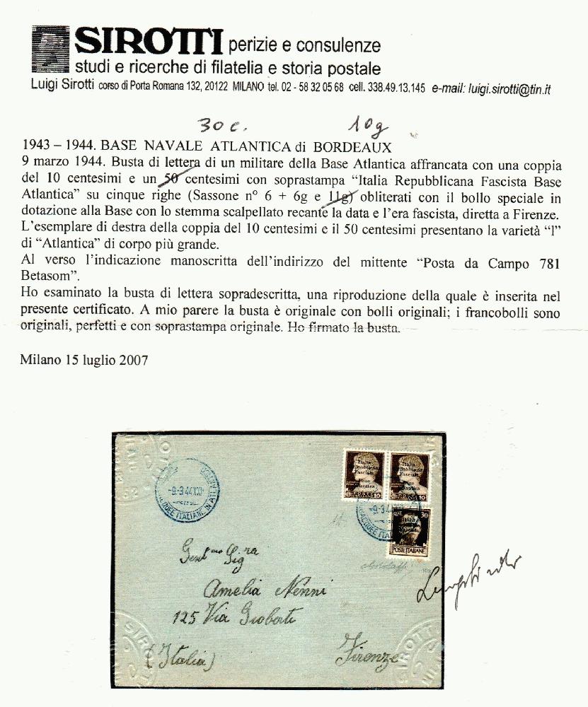 | Zusatzinformationen und Suchstichworte: | Filatelia Sammarinese Saalauktion 8. - 9. September 2023 Los 1814 Italien Italia Repubblicana Fascista Base Atlantica 10 c., 2 es. di cui uno "I" di "Atlantica" di altro corpo come il 30 c. che completa l'affrancatura (6+6g.+11g.) ann. col bollo azzurro scalpellato della Base 9.3.44 su busta a Firenze. AD, storico cert. G.Bolaffi del 1961 + cert. Sirotti Ausruf 700,00 EUR |