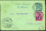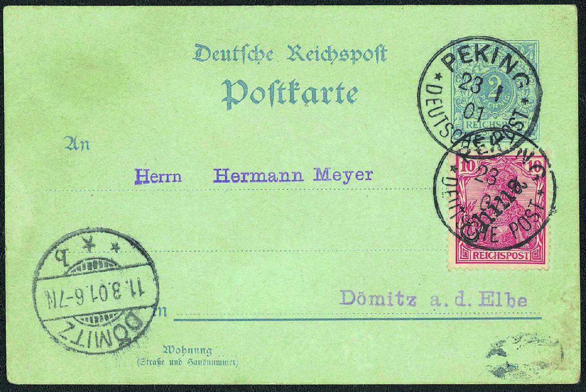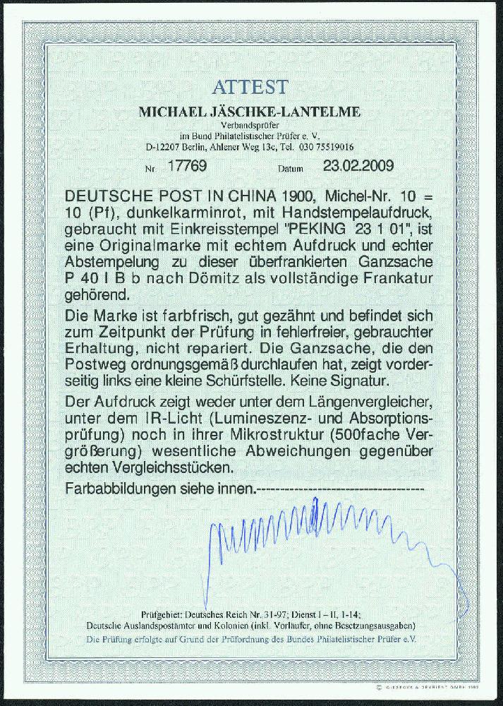 | Zusatzinformationen und Suchstichworte: | Gert Müller 119. Auktion 24. - 26. August 2023 Los 2607 Deutsche Auslandspost China 10 Pfg. dunkelkarminrot mit Handstempel "CHINA", farbfrisches Luxusstück als Zusatzfrankatur auf Ganzsache 2 Pfg., diese unbedeutende kleine Schürfung, mit zwei klaren K1 "PEKING DEUTSCHE POST 23.1.01" nach Dömitz mit Ankunftsstempel. Ein außerordentlich dekorativer Beleg, zumal Frankaturen der Handstempel generell selten sind! Fotoattest Jäschke-Lantelme BPP Ausruf 1.200,00 EUR |